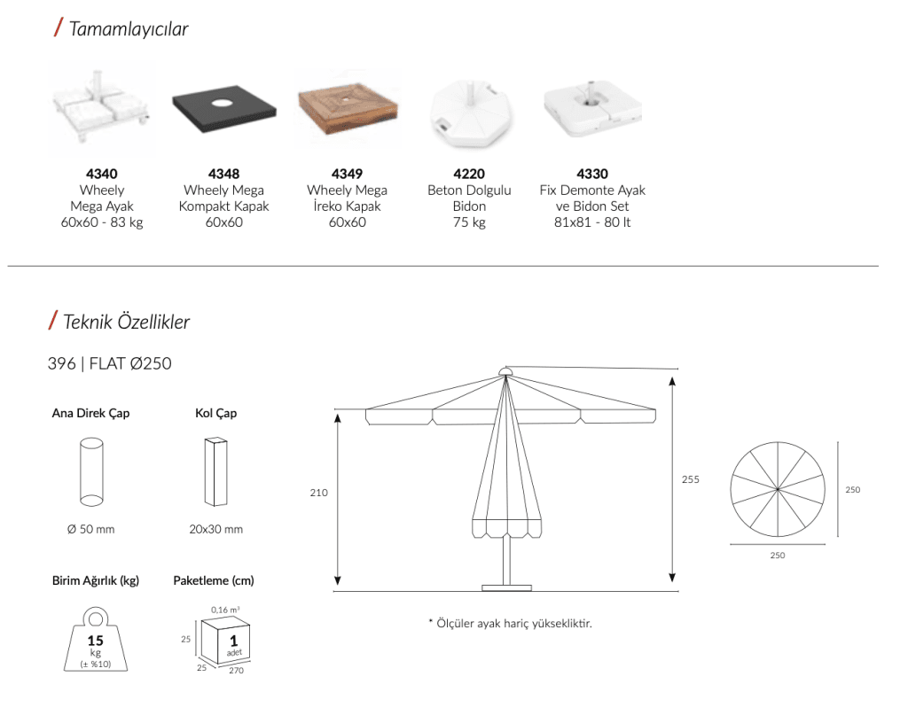 Ürün fonksiyonlarındaki sadeliğin simgesi olan FLAT modelimiz, tamamen sizlerin şemsiyenizi en basit biçimde açıp, kapatmanızı sağlayacak bir düzenek üzerinde üretilmiştir. Sahip olduğu Slide System sayesinde, tek hamlede açılıp, tek hamlede kapanmaktadır. Federli kol yapısı ve yüksek dirençli ekstrüze alüminyum çark düzenekleri sayesinde, sorunsuz bir şekilde uzun süreler kullanımı hedeflenmiştir. Akrilik ve PP kumaş seçenekleri ile sizlere zengin olanaklar sunmuş olup, mimari çizgilerinize uygun olarak ürün üretimi saplanabilmektedir. Kahverengi, siyah ve inoks isleket renk seçenekleri ile bahçe, havuz ve tesislerde şık ve uzun süreli kullanım sunar.